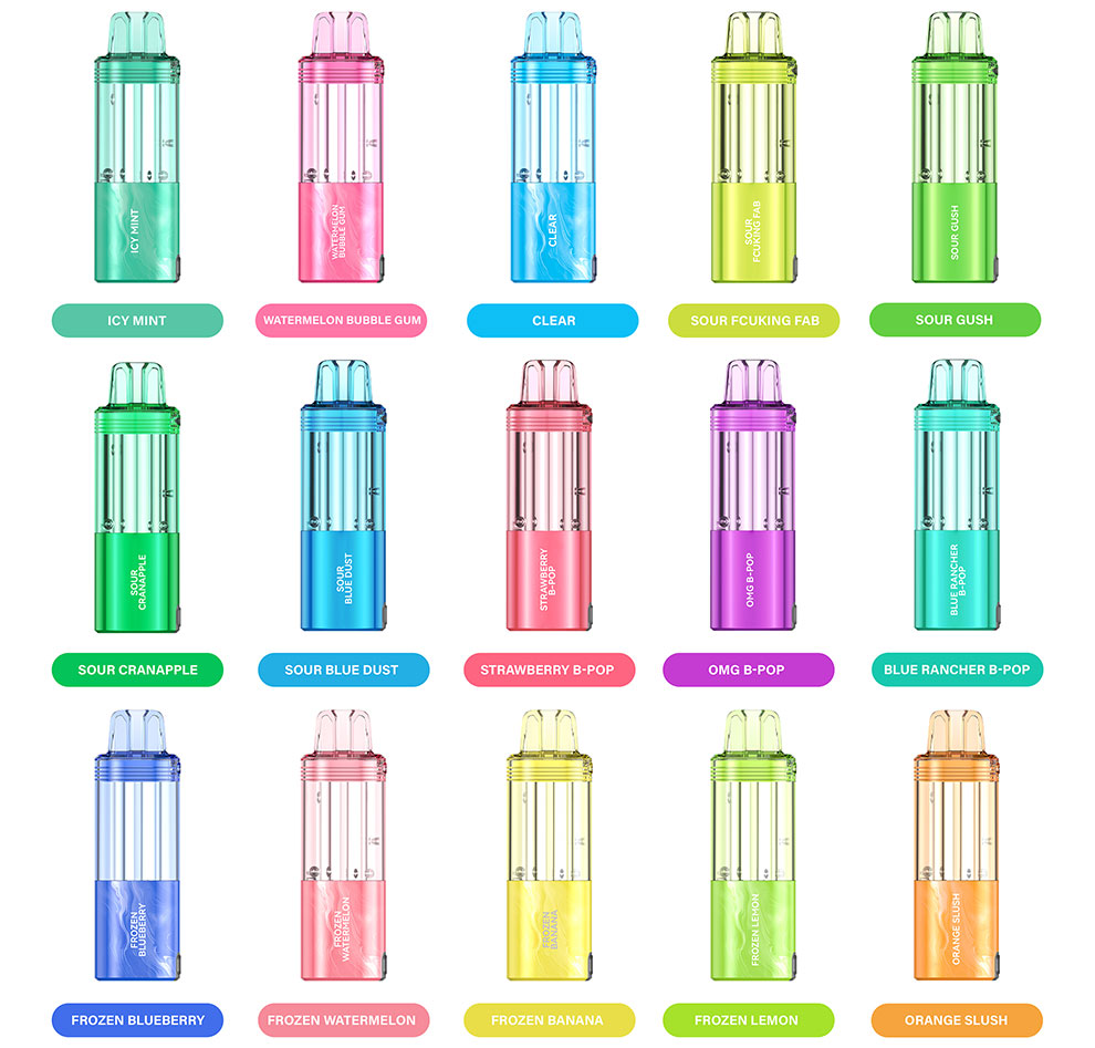 Flavors : Watermelon Ice, Cool Mint, Strawberry Kiwi, Sour Apple Ice, Blue Razz Ice, Strawberry Watermelon, Gummy bear, Juicy Peach Ice, Gum Mint, Kiwi Dragon Berry, Strawberry Banana, Pineapple Coconut , Blueberry Watermelon, Strawberry Ice, Coffee, Mexico Mango, Miami Mint, Strawberry Cupcake, White Gummy, Tobacco,Icy Mint, Watermelon Bubble Gum, Clear, Clear, Sour Fcuking Fab, Sour Gush, Sour Cranapple, Sour Blue Dust, Strawberry B-POP, OMG B-POP, Blue Rancher B-POP, Frozen Blueberry, Frozen Watermelon, Frozen Banana, Frozen Lemon, Orange Slush, Cola Slush, Grape Slush, Vanilla Cupcake, Coconut Cupcake, Chocolate Cupcake, Skittles Cupcake, Red Velvet Cupcake, Pink&Blue, Meta Moon, Pink Lemonade, Cherry Bomb, Dragon Fruit Lemonade, Cherry Slush, Strawberry Slush, Peach Sluch, Hawaiian Punch, Triple Berry Punch, Purple Passion Punch, Sour Raspberry Punch, Blueberry Cotton Candy, Watermelon Cotton Candy, Strawberry Cotton Candy, Vanilla Ice Cream, Strawbana Ice Cream, Frozen Blackberry, Frozen Pineapple, California Cherry, Berry Bliss, Dragon Melon, etc.